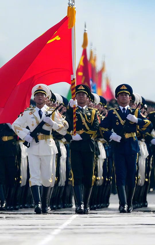 V 10 hodin, kdy vojenská přehlídka začala, zazněla slavnostní státní hymna a všichni zúčastnění spontánně vstali k poctě. Úhledné kroky nožních formací, sofistikované vybavení zbrojních kolon a majestátní vzdušné jednotky všechny hluboce šokovaly a ukazovaly zlepšení síly národní obrany Číny. Vyvěšením 80 čestných vlajek jednotek protijaponských válečných hrdinů si lidé také uvědomili, jak těžce vybojované vítězství bylo.