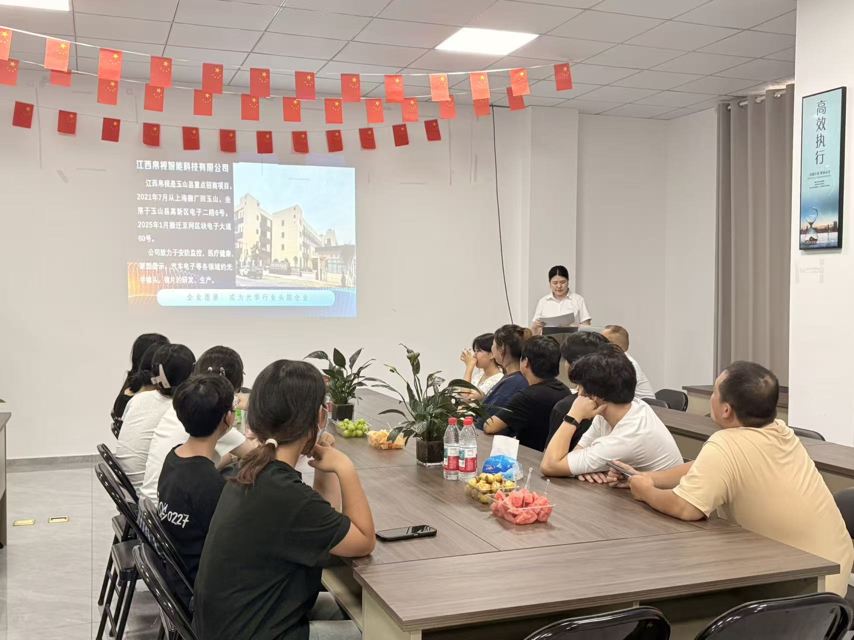 Sdíleli jsme cestu společnosti – od jejího přemístění ze Šanghaje do Yushanu až po její současný cílený pokrok v oblasti optiky – a zdůraznili trvalou oddanost společnosti Silk výzkumu a vývoji hardwaru a inovacím v odvětvích, včetně bezpečnostního dohledu, lékařského zdraví a automobilové elektroniky. Slogan „Efficient Execution“ zobrazený na zdi výstižně odráží provozního ducha týmu. Toto setkání sloužilo nejen jako úvod do firemní kultury, ale také jako jasné sdělení firemní vize: stát se nejhodnotnějším podnikem v optickém průmyslu.